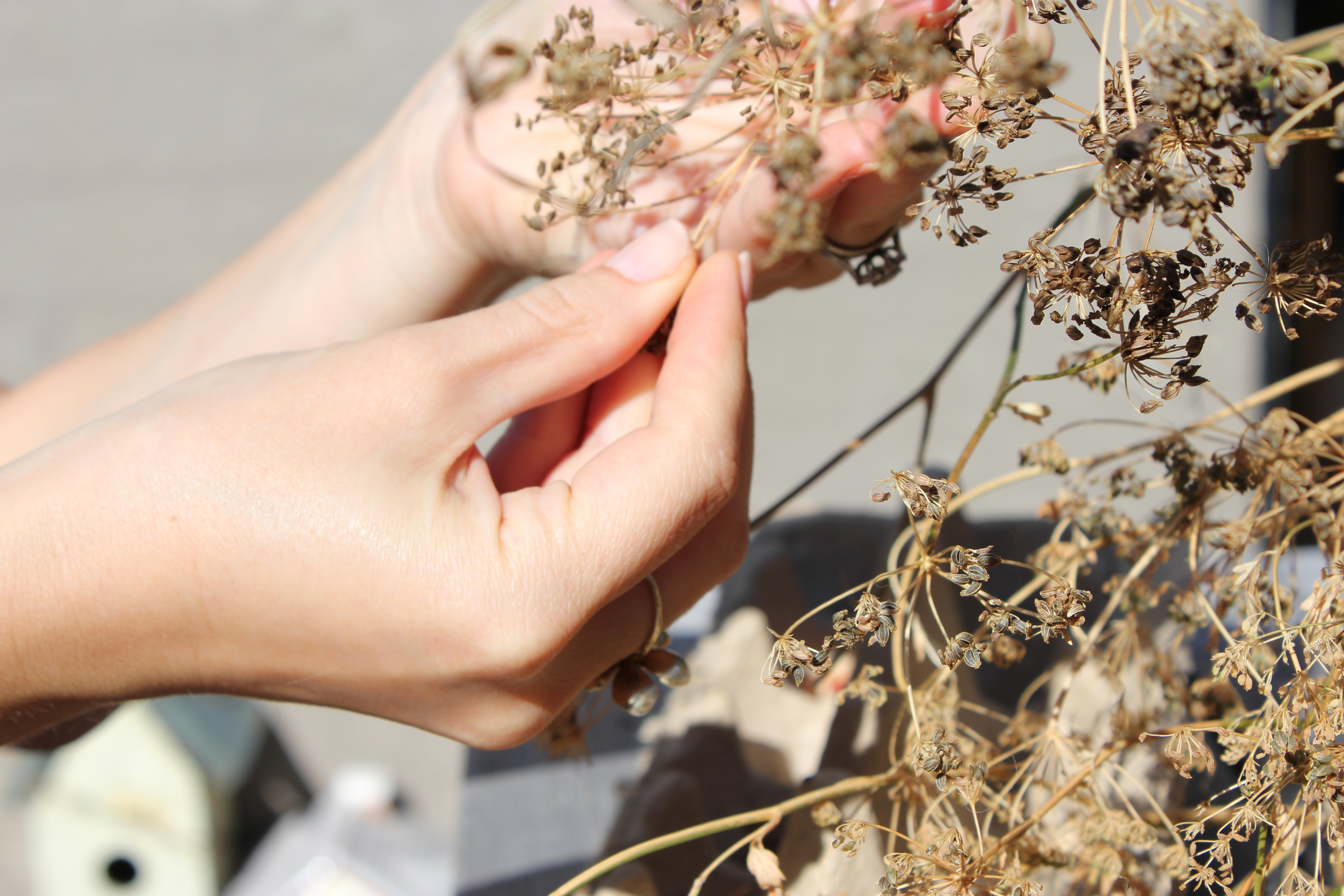 My parsley plant went absolutely berserk this year with flowers that soon turned into seeds. Rather than the seeds blowing away into the next door neighbors yard, I trimmed the stems and dried the seeds out by leaving them in the sun for a few days. I then collected all the tiny seeds and stored them in an empty egg carton for replanting next season. I love the way the twiggy stems look in recycled glass vessels like old milk bottles or jam jars. You can also use parsley seeds in cooking. Fun!