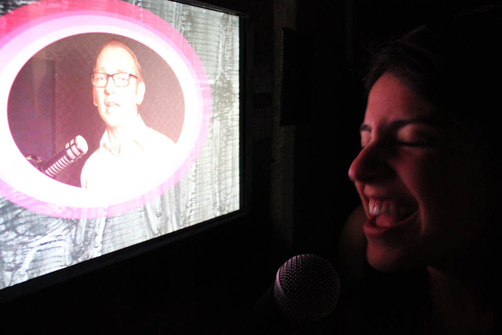 Cherry exploring one of the interactive Karaoke booths